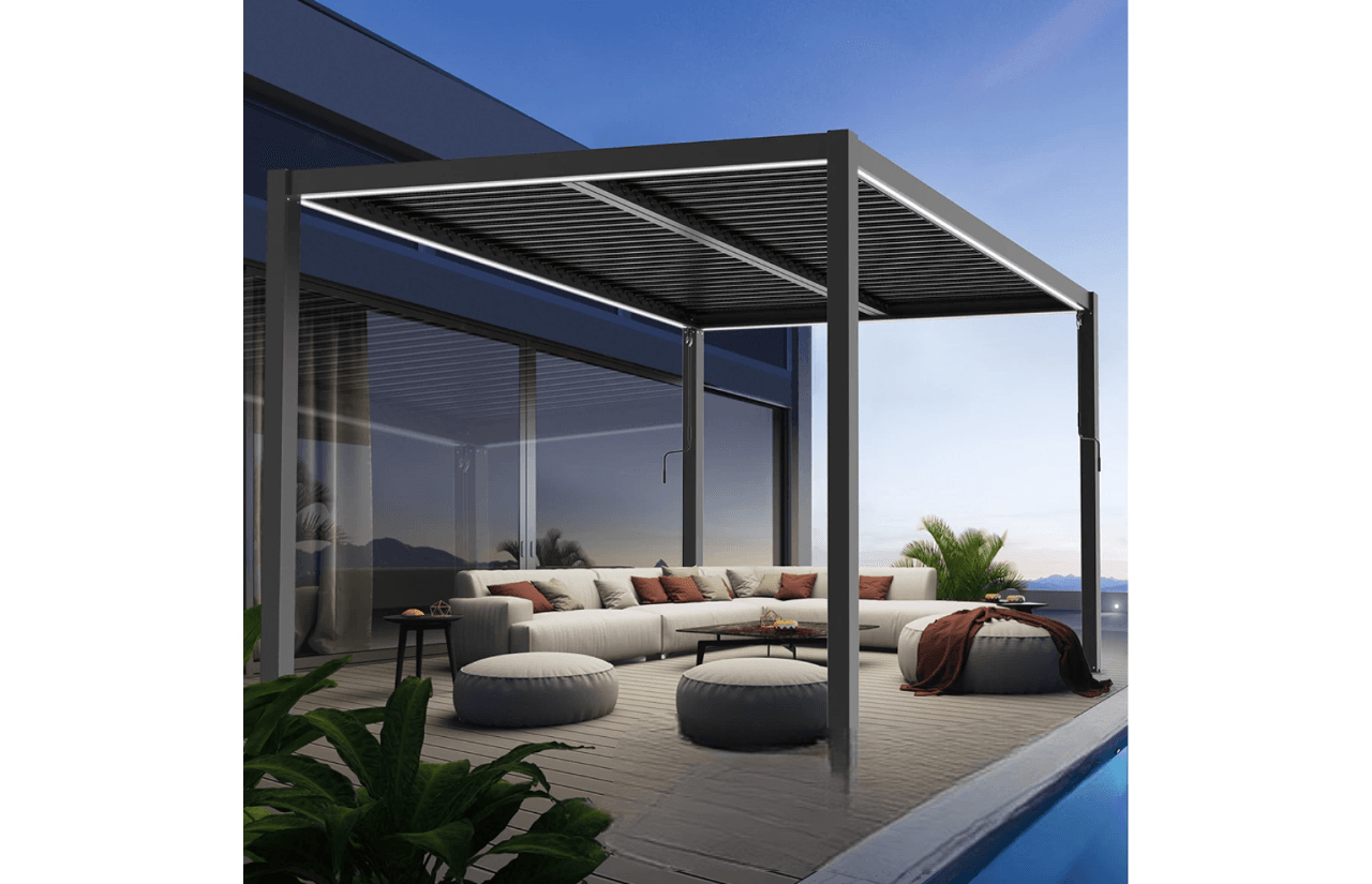 Cu ajutorul pergolei bioclimatice iti poti transforma gradina intr-un spatiu de poveste. Aceasta pergola din aluminiu, echipata cu un cadru solid, dar usor in acelasi timp, este o pergola de gradina speciala, datorita sistemului sau bioclimatic inteligent, realizat cu tehnologie de varf, multumit caruia iti poti ajusta nivelul de lumina si de ventilatie din interiorul ei in functie de preferinte si de temperatura de afara.